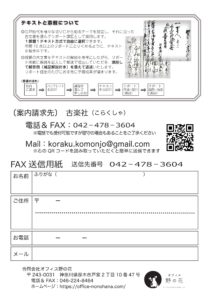 合同会社オフィス野の花内に新たに近世古文書講座部門「古楽社」を開設します。担当は、NHK学園の古文書講座講師として25年の実績がある笠原綾さんと堀亮一さんです。まずは来年の1月から古文書の添削指導から始めます。さまざまなジャンルの古文書から学びたい古文書を年に10点以上選び、自分で読んで筆写したものを提出します。すると!ていねいに添削をした上で、読む上での注意点、問題点などを添えた回答を返送します。こうして1つ1つの古文書をしっかりと読んでいき、その成果が御手元に残るようにしたいと思っています。
